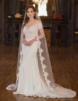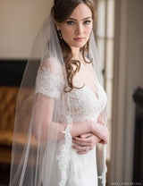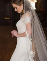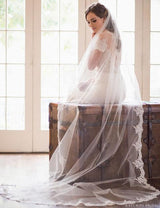 Embellish your wedding gown with a beautifully beaded Alençon lace cathedral length veil. This romantic style features rolled edge for 22" and gorgeous lace along the sides and bottom curve. Wear this dramatic design to gracefully enrich any ensemble with timeless elegance.