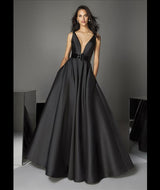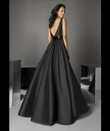 Ravishing gown in shiny Mikado with deep, plunge bodice, structural bust with a dramatic fit and flare effect where waistline meets wavy princess skirt.