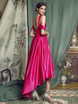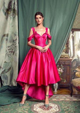 High-low cocktail dress with a bustier bodice. Available in Red; Black; Ivory.