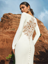 A clean, crepe silhouette with gentle draping over the bodice and waistline. Spectacular lace back finished with shoulder-to-hemline row buttons, and long fitted sleeves perfect for elegant, indoor wedding ceremonies.