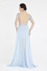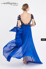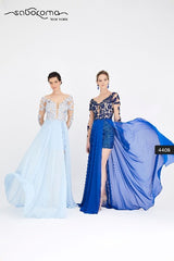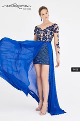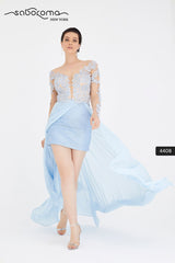 Wrap yourself in an upscale style that is bound to leave the crowd speechless in this Saboroma 4408. Stunning beaded embroidery appliques ornate the sheer bodice and long sleeves of this modish gown. Features scoop neckline and deep scoop back. A lush floor length overskirt splits at front side revealing the solid toned fitted mini-skirt innerlay. Make you every dream come true in this sophisticated Saboroma masterpiece.