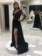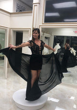 Details: Sheer long sleeves and bodice, See through bra cups, Beaded embroidery appliques, Mini skirt innerlay, Floor length overskirt, Back zipper closure