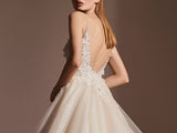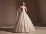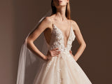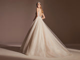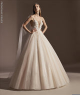 Pronovias dress with pink, shimmering, voluminous skirt, spaghetti straps, deep, plunging neckline and rich 3D embroideries on sexy bodice.