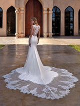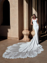 A gorgeous, dramatic mermaid look. The clean-cut crepe design is fitted through the bust and skims the hips seductively. Features a jaw-dropping back design with illusion lace, sculptural seam, and a stunning scalloped train.