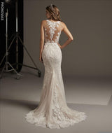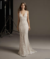 Pronovias Mermaid dress with a natural waist, crafted in lace and tulle, hugs the silhouette, streamlining it to the maximum and enhancing the sensuality of the V-neckline. Subtle mermaid dress in light pink lace with V-neck and illusion sleeves and back.