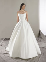 A stunning princess-cut model that evokes the most modern minimalism. The bodice features flattering pleats thanks to its Mikado fabric, and they descend to the skirt, which has pockets and a wide train. Features an open back.
