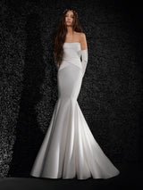 An architectural take on the mermaid gown. With a bustier bodice formed with wide pleats and folds, and sculptured fishtail skirt constructed with panels.