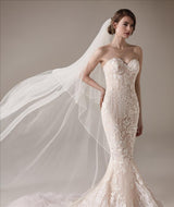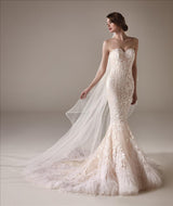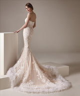 Shiny cuts of butterfly flowers flutter about the sweetheart bodice and upper skirt of this feminine mermaid gown, which features a beautiful, feathered train of peachy tulle. This gown has an open back, delicate beading, and a feather trim.