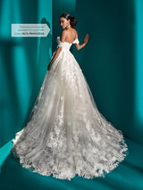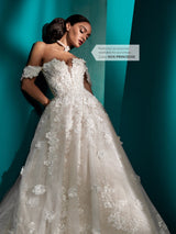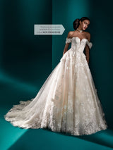 An ultra-glam siren dress in soft tulle highlighted with sparkly embroidery and 3-D Lace in ivory and champagne shade. With a trendy corset bodice featuring a deep sweetheart neckline supported by inner corset and cups with off the shoulder sleeves.