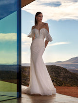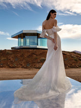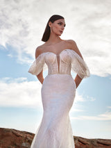 Exquisite craftsmanship meets modern design flair in this modern wedding dress. Crafted in glitter tulle with a superb bustier-style bodice with exposed boning and off-shoulder ruffles piling on the sensuality and glamour. The mermaid-cut skirt accentuates the hips and flows into a chic glamorous train.