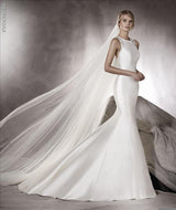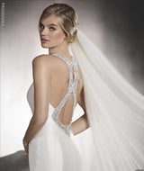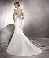 Pronovias Agnes is a unique and spectacular wedding gown in Off-White Royal Satin that frames the figure from the halter neckline  down to  dramatic back with beautiful gemstones.