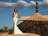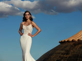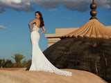 This ultra-glamorous mermaid wedding dress stuns with a mixture of Modern, floral applique and beads. Deep back and neckline with a nude tulle insert and inner cups for support.