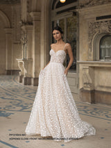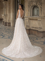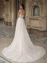 This youthful wedding dress is made of soft and summery field-of- flowers embroidered tulle and features a strapless sweetheart neckline and a court train.