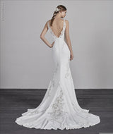 A mermaid wedding dress,  with a V Neckline and back detail, fitted at the waist, with the skirt and train in crepe. Beautiful Lace Insert on the train is a stunning statement in the dress.